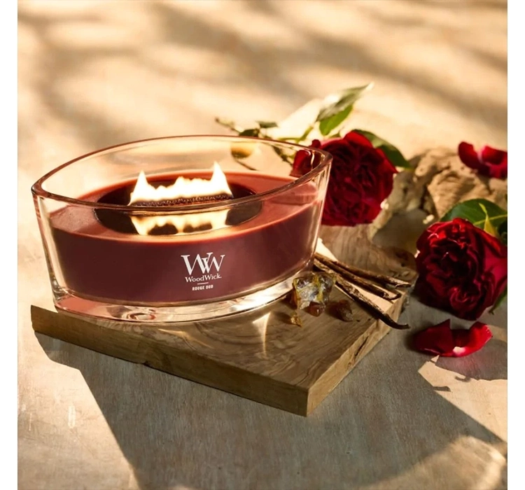 Секрет винятковості ароматичної свічки Woodwick Rouge Oud — її складна і глибока ароматична композиція. Верхні ноти відкриваються чуттєвою сумішшю кориці та бергамоту, а в серці аромату домінують елегантні квіткові акорди троянди та жасмину. Композицію завершує база з кедрового дерева, бурштину, пачулі, сандалового дерева, ванілі та мускусу, створюючи теплу, чуттєву та стійку суміш.