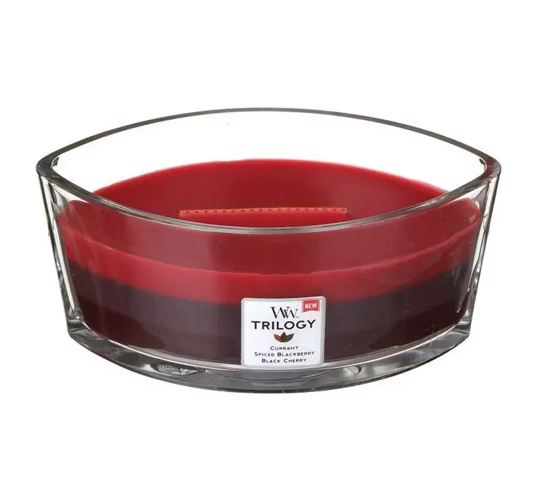 Woodwick Trilogy - це унікальна триколірна свічка, в якій кожен колір має різний аромат. Свічка WoodWick Ellipse Candle Sun-Ripened Berries – це комбінація Currant, Spiced Blackberry та Black Cherry. Currant – це солодка смородина, Spiced Blackberry – це аромат стиглої ожини, приправленої корицею, а Black Cherry пахне соковитою вишнею.