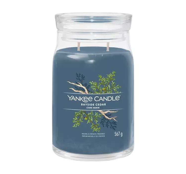 Ароматична свічка Yankee Candle Signature Bayside Cedar є деревним кедровим ароматом, доповненим нотами грейпфрута, мандарину та теплої амбри.