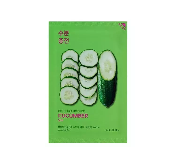 Holika Holika Pure Essence Mask Sheet Cucumber Маска на бавовняній тканині з екстрактом огірка. Вона володіє освіжувальним, заспокійливим ефектом. Огірок має оживляючі властивостями, розслаблює шкіру і зменшує набряклість обличчя. Він містить багато вітамінів і мінералів, тому допомагає зволожувати шкіру і діє проти зморшок. Маска очищає, тонізує і освітлює шкіру.