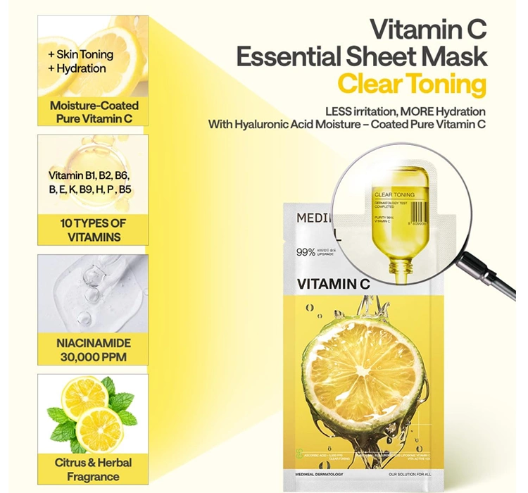Після зняття маски шкіра виглядає пружною та сяючою. Вона стає м’якшою та еластичнішою, а дрібні недоліки розгладжуються. Регулярне використання освітлювальної та зволожуючої тканинної маски Mediheal Vitamin C допомагає підтримувати здорову, сяючу шкіру обличчя кожного дня. Це ідеальний вибір для тих, хто бореться з тьмяною, втомленою шкірою або нерівномірним тоном. Достатньо лише однієї процедури, щоб відчути різницю та відновити природне сяйво свого обличчя.