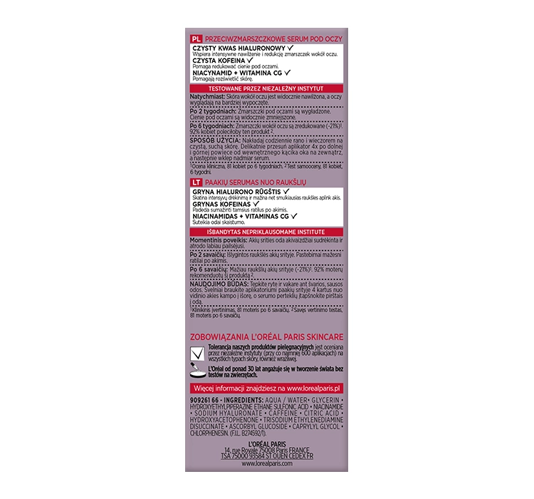 Сироватка під очі Revitalift Filler від L'Oréal Paris забезпечує ніжній шкірі достатнє зволоження та миттєвий ефект ліфтингу. Рекомендується, зокрема, для догляду за зрілою шкірою з помітними ознаками в’ялості шкіри та появою зморшок. Сироватка під очі Revitalift Filler проти зморшок володіє передовими омолоджуючими властивостями. Містить аж 2,5% чистої гіалуронової кислоти, яка інтенсивно зволожує шкіру, запобігаючи її в'ялості та фотостарінню. Володіє зміцнюючими властивостями і повертає шкірі еластичність. Додавання кофеїну та ніацинаміду, які освітлюють тіні, додають блиск і сяйво. Очі стануть більш відкритими та сяючими.