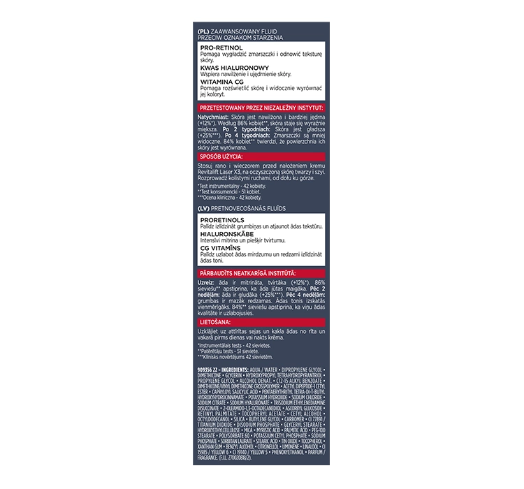 Revitalift Laser X3 збагачений фрагментарною гіалуроновою кислотою, яка швидко проникає в шари шкіри (протестовано in vitro), щоб точно зменшити зморшки.
