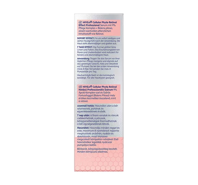 Nivea Cellular — це серія засобів для догляду за зрілою шкірою всіх типів. Вона була створена, щоб відновити належний рівень зволоження, гладкості та пружності. Професійна сироватка для обличчя містить аж 9% комплексу для догляду, підкріпленого рослинним інгредієнтом, схожим на ретинол. Це альтернатива, яка дає приголомшливі візуальні ефекти. Потрібно лише 7 днів регулярного використання сироватки Nivea Cellular Phyto Retinol Effect - вранці та ввечері, і Ви помітите вражаючі ефекти.