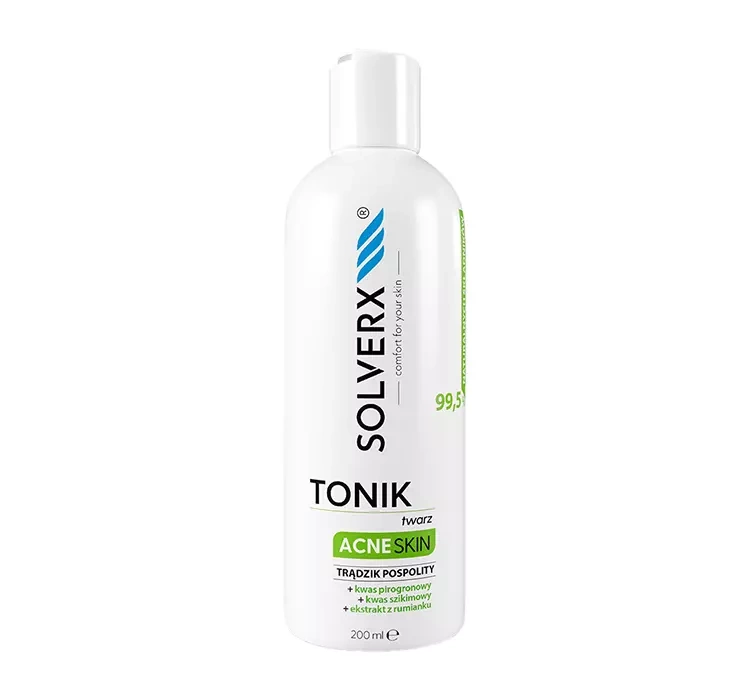 Тонік для обличчя із серії Solverx Acne Skin регулює роботу сальних залоз і знімає запалення. У його складі Ви знайдете: піровиноградну кислоту, шикімову кислоту, екстракт ромашки та екстракт кори дуба. Ці компоненти запобігають утворенню недосконалостей, мають антибактеріальну та відлущувальну дію. Крім того, вони знімають запалення, а також мають заспокійливу дію.