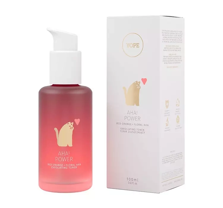 YOPE AHA! Power призначений для всіх типів шкіри, а спеціально розроблений склад забезпечує мікровідлущування, тонізацію та зволоження. Косметичний засіб підтримує процеси регенерації та оновлення шкіри, а також зменшує її чутливість та схильність до подразнень.