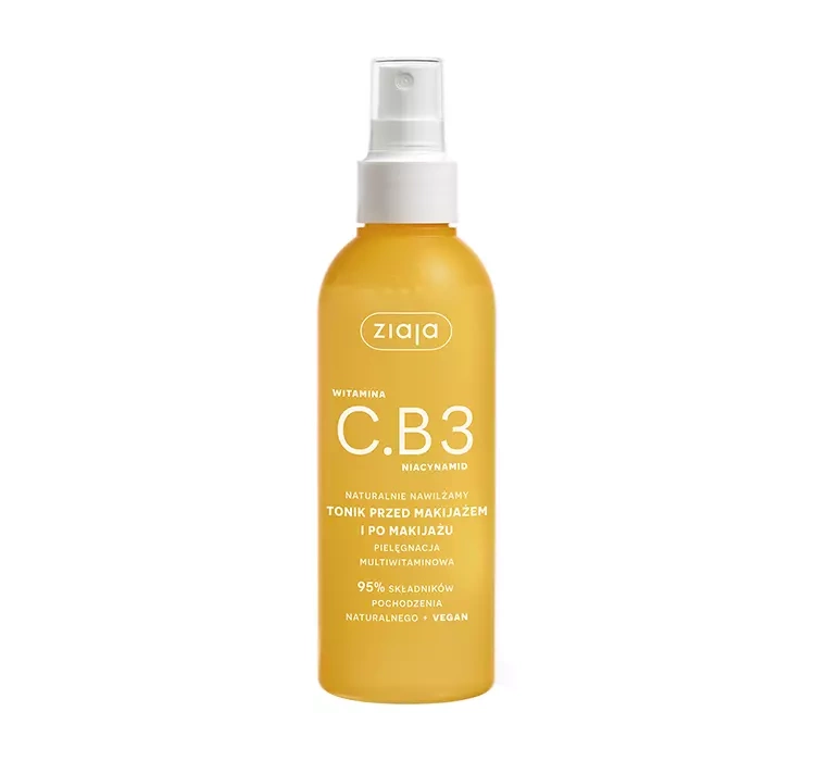 Тонік у формі спрею Ziaja Vitamin C. B3 Niacinamide підходить для всіх типів шкіри як живильний і тонізуючий засіб. Він також добре підійде для підготовки шкіри перед нанесенням макіяжу, під час нанесення кремових продуктів, а також для завершення всього образу. Рідка формула наповнена есенцією активних вітамінів - головним чином C і B3 (ніацинамід), а також B5, B6 і E. Тонік Ziaja до і після макіяжу має тонізуючу, заспокійливу, стимулюючу та освітлюючу дію. Крім того, вітамінний тонік Ziaja C. B3 має свіжий, цитрусовий аромат, що робить його використання більш приємним і надовго залишається помітним на шкірі.
