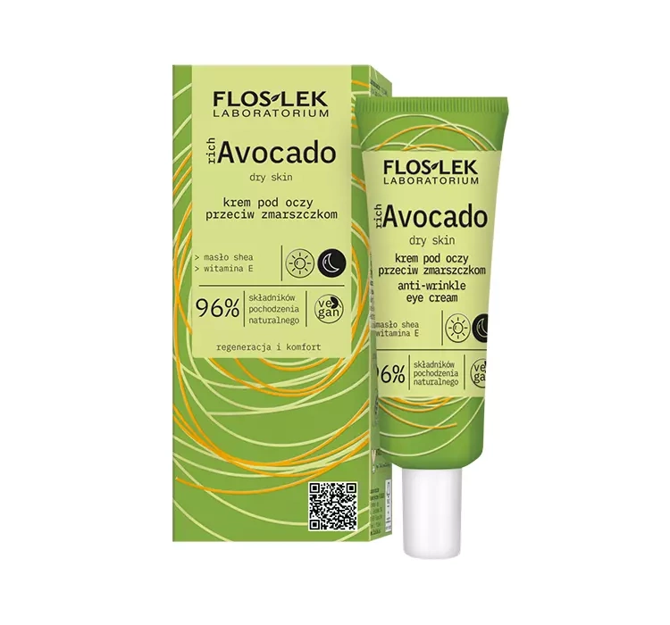 Floslek Rich Avocado Anti-Wrinkle Eye Cream має приємну оксамитову текстуру, яка ніжно обволікає чутливу шкіру навколо очей і повік. Він належним чином відновлює та змащує її, роблячи вигляд більш відпочилим та свіжим. Його можна використовувати вранці і ввечері. Крем для повік проти зморшок з ліпідами зменшує видимість набряків, темних кіл і мішків. Усе це завдяки вмісту натуральних активних інгредієнтів, серед яких: кремове масло ши, вітамін Е, троксерутин, екстракти кінського каштана і арніки.
