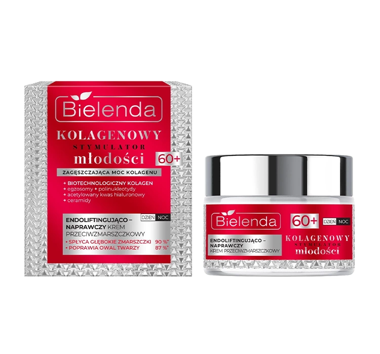 Ендоліфтинговий і відновлюючий крем проти зморшок 60+ Bielenda Колагеновий Стимулятор Молодості забезпечує ліфтинг-ефект, покращує структуру шкіри, зміцнюючи і вирівнюючи обличчя. Біотехнологічний колаген, що міститься у формулі, робить шкіру молодшою. Рівень колагену відновлюється, шкіра стає щільнішою та підтягнутою, а зморшки зменшуються.