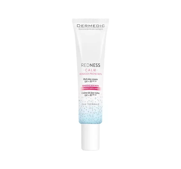 Крем на день Dermedic Redness Calm Rich є унікальним косметичним засобом, який ефективно запобігає утворенню та закріпленню почервоніння, еритеми або розширення кровоносних судин. Інноваційна формула косметичного засобу зміцнює, стимулює регенерацію та живить шкіру, покращуючи її стан та зовнішній вигляд. Комплекс Rosashield заповнює дефіцит вітамінів і мікроелементів, завдяки чому шкіра відновлює свій баланс і стає менш сприйнятливою до негативного впливу зовнішніх факторів або окислювального стресу, що є причиною прискореного старіння. Склад крему також збагачений комплексом фільтрів (SPF20) UV + IR, які захищають шкіру від перегріву та сонячного випромінювання. Крім того, продукт заспокоює всі подразнення та зменшує гіперреактивність епідермісу. Косметичний засіб є гіпоалергенним та некомедогенним і містить термальну воду.