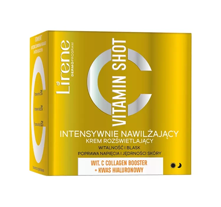 Інтенсивно зволожуючий освітлюючий крем Lirene VITAMIN SHOT збагачений вітаміном С, який зменшує плями та вирівнює колір, підтримує процеси регенерації та захищає від шкідливого впливу зовнішніх факторів.