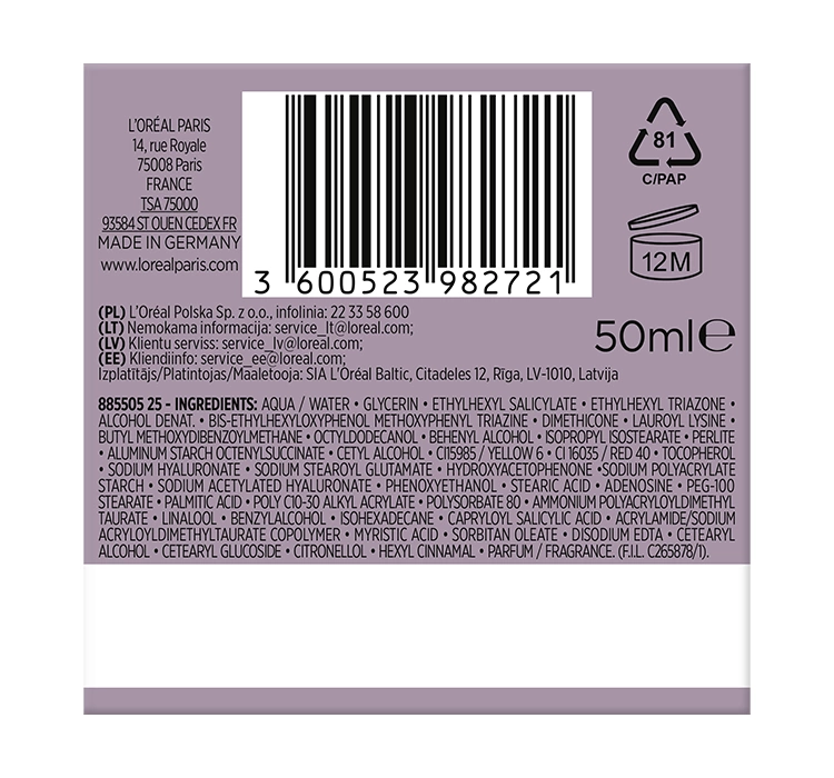 Інтенсивно наповнюючий крем anti-age SPF 50 з лінії Revitalift Filler від французького бренду L'Oréal Paris має інноваційну формулу, збагачену мікронаповнювачою гіалуроновою кислотою. Косметика чудово заповнює зморшки і повертає шкірі природний об'єм, завдяки чому вона повертає їй молодий вигляд.
