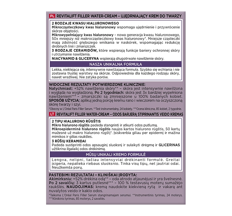L'Oreal Paris Revitalift Filler Water-Cream - крем для обличчя створений за технологією airless, що гарантує тривалу свіжість формули. Косметичний засіб зменшує зморшки та забезпечує глибоке зволоження шкіри. Крім того, зміцнює захисний бар'єр шкіри та захищає її від шкідливих факторів зовнішнього середовища.