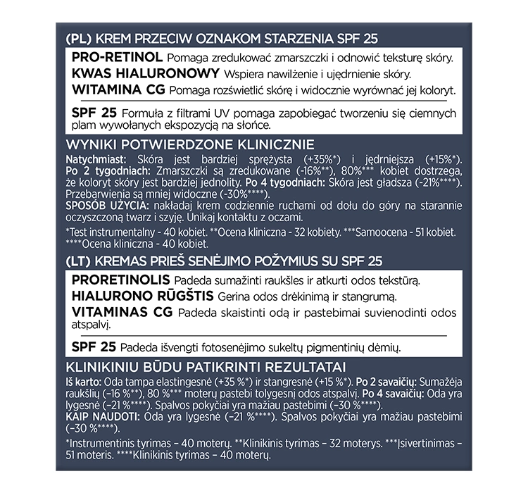 Засіб відмінно коригує зморшки, допомагає тонізувати шкіру та відновлює її щільність, обмежуючи ознаки старіння. Крім того, він збагачений концентрованою Ліпо-Гідрокси-Кислотою, яка відлущує шкіру, одночасно згладжує її та забезпечує рівномірним кольором.