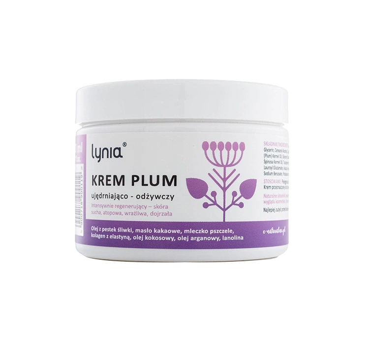 Зміцнююче-живильний крем від Lynia - це унікальний косметичний засіб для щоденного догляду за сухою, чутливою, атопічною, зрілою шкірою та шкірою з розтяжками. До його інноваційного складу входить кака-масло, яке сприяє регенерації та глибоко зволожує шкіру та колаген з еластином, що підвищує еластичністьі і пружність, а також має сильний антивіковий ефект. Значний вплив на поліпшення стану шкіри має вміст екстракту щитолисника азіатського, який має протизапальні властивості та уповільнює процес старіння шкіри. Крім того, стимулюючи вироблення гіалуронової кислоти, підвищується рівень зволоженості шкіри і відновлюється її гладкість і оксамитова м'якість. Формула також збагачена дорогоцінними оліями, які мають широкий спектр дії. Багата на вітаміни олія солодкого мигдалю помітно омолоджує шкіру та покращує її зовнішній вигляд, кокосова олія заспокоює подразнення та запобігає лущенню сухої шкіри, арганова олія підтримує природний захист клітин і бореться з розтяжками, а олія кісточок сливи фантастично пом'якшує та залишає чудовий аромат марципану.