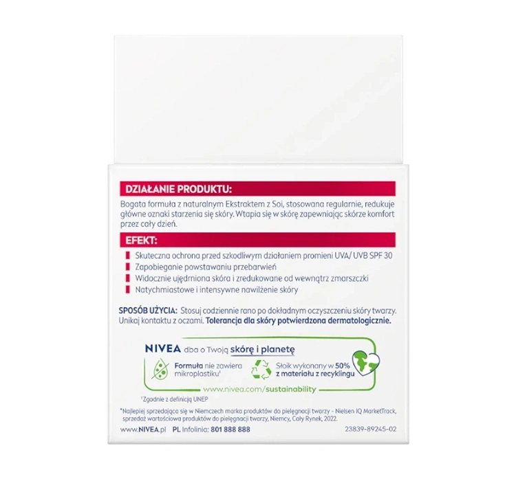 Зміцнюючий денний крем SPF30 Nivea Vital Soja для зрілої шкіри - правильний косметичний засіб для регулярного щоденного використання. Миттєво зволожує, зміцнює та наповнює шкіру зсередини, роблячи її більш еластичною, гладкою та підтягнутою. Все завдяки поєднанню гіалуронової кислоти та натурального екстракту сої. Вони підвищують здатність шкіри зв'язувати воду. Крім того, продукт має захисний сонцезахисний крем SPF30. Це правильний захист для шкіри протягом дня, окремо або під макіяжем. Крем діє комплексно, проти зморшок.