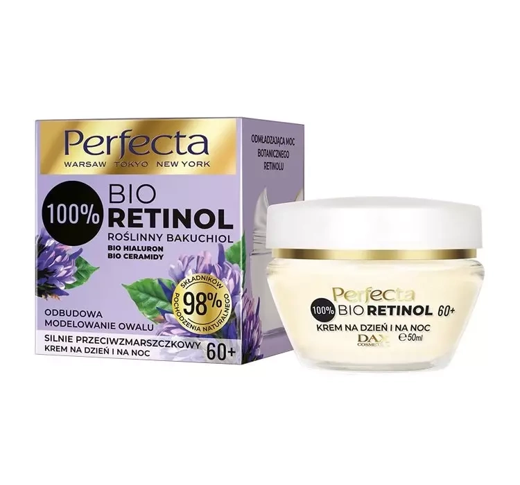 Perfecta Bio Retinol - це крем для обличчя, що сильно діє проти зморшок, для денного та нічного використання. Він був створений для догляду за шкірою після 60 років. Його завдання - підтягнути, покращити контури обличчя та відновити шкіру.Він містить до 98% складників природного походження. Їх поєднання помітно омолоджує шкіру, а також робить її пружною і підтягнутою.Крем засновує свою силу на дії біоретинолу, це екстракт із насіння аюрведичної рослини Babći. Він зменшує зморшки та лінії, вирівнює тон шкіри та згладжує поверхню шкіри. Більше того, крем дуже делікатний, не подразнює і не викликає фотосенсибілізації. Крім того, біоцераміди відновлюють ліпідний шар епідермісу та регенерують його.Perfecta Bio Retinol рекомендується для щоденного догляду. Вже після першого застосування крему шкіра стає наповнена комфортом, підтягується та відновлюється. Можна використовуватися як основу для макіяжу.