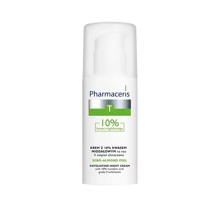 Pharmaceris T Sebo-Almond Peel нічний крем з 10% мигдальною кислотою призначений для щоденного догляду за шкірою схильною до акне, а також для чутливої та делікатної, жирної та з нерівномірним кольором. Його можна безпечно використовувати протягом року, але влітку рекомендується використовувати крем з фільтром від SPF 20.