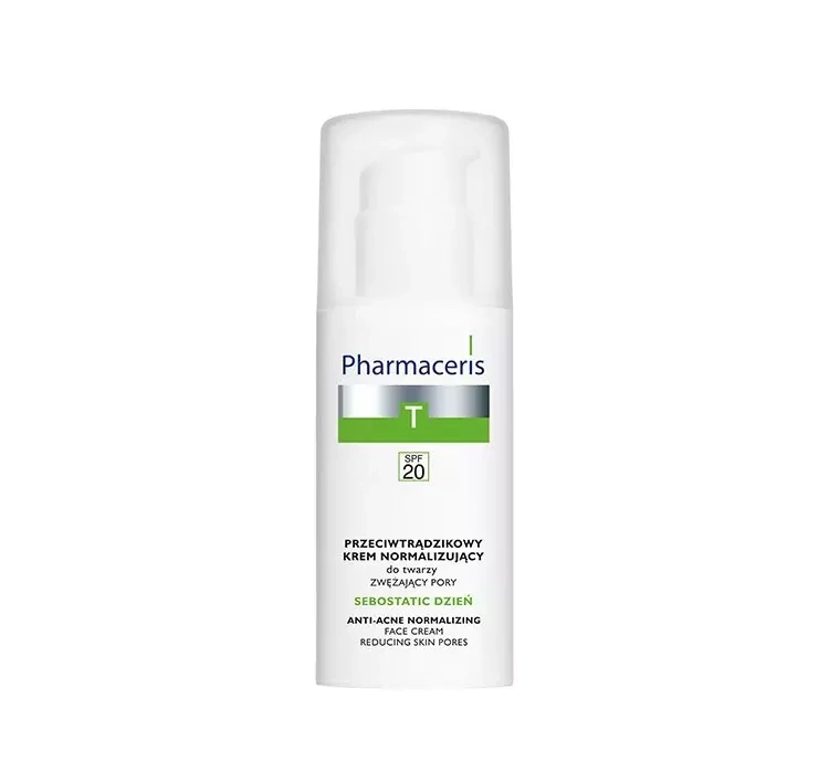 Pharmaceris T - це серія дермокосметичних засобів для шкіри, схильної до вугрів. Вона включає очищувальну та заспокійливу косметику для догляду. Постакне, хоча вони характерні особливо для молодої шкіри, не повинні бути повязаними з віком. Догляд за проблемною шкірою, незалежно від віку, ґрунтується на тих самих принципах. Її слід захищати від сонця, регулярно очищати і не пересушувати. Лінія Pharmaceris T включає косметику, яка допоможе у виконанні кожного з цих кроків. Нормалізуючий крем для обличчя Pharmaceris T рекомендується для щоденного догляду за комбінованою, жирною шкірою, схильною до акне, жирного блиску та періодичними недоліками, для людей з розширеними порами і нерівномірною структурою шкіри. Крем зменшує постакне, звужує пори та захищає від шкідливого сонячного випромінювання. Формула Pore-Diminish очищає пори, естери винної кислоти і піроктонат оламіну регулюють секрецію шкірного сала, а лимонна кислота освітлює шкіру, вирівнюючи її тон.