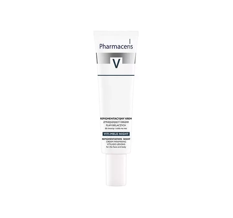 Pharmaceris V репігментаційний крем для зменшення розміру білих плям на ніч можна використовувати для обличчя та тіла для дорослих та дітей віком від 5 років, задля захисту та догляду за шкірою з депігментованими змінами . Він ефективно вирівнює колір і запобігає збільшенню ділянок білих плям. Кращий результат можна отримати якщо застосовувати терапію в поєднанні з лампою NB-UVB.