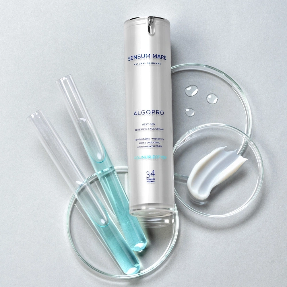 Формула Sensum Mare Algopro базується на унікальному 9% комплексі пептидів та амінокислот з PDRN, який стимулює клітинну регенерацію та зміцнює структуру шкіри. Склад крему Sensum Mare збагачений 34 активними компонентами, серед яких біоміметичні пептиди, рослинні полінуклеотиди з Artemisia Capillaris, 3D гіалуронат натрію та комплекси водоростей і морських олій. Таке поєднання діє багатогранно: відновлювальний крем Sensum Mare зволожує, підтягує, заспокоює подразнення та підтримує ревіталізацію шкіри.