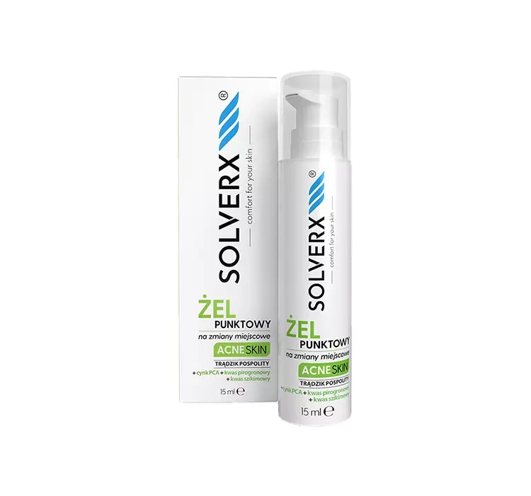 Дерматокосметичний засіб для місцевих запалень, пов’язаних із акне у вигляді точкового гелю Solverx Acne Skin, заспокоює запалення та регулює роботу сальних залоз. Крім того, він ефективно зменшує плями та недосконалості та запобігає їх повторній появі.