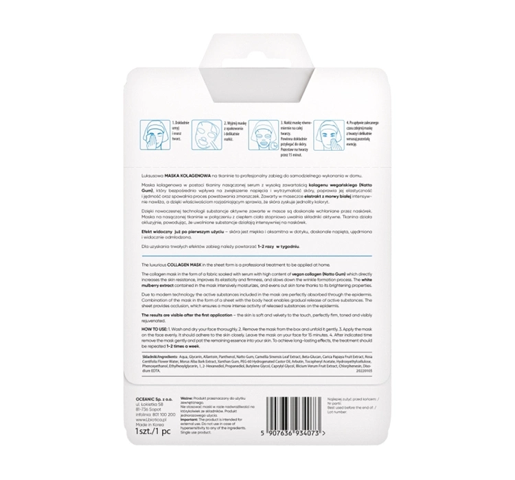 Колаген зміцнює, покращує еластичність шкіри та її природну пігментацію, а також запобігає утворенню зморшок. Біологічно активний пептидний комплекс зміцнює структуру шкіри, прискорює метаболізм клітин, формує контури і надає обличчю красивої форми. Гіалуронат натрію забезпечує шкірі належний рівень зволоження та захищає від втрати еластичності. Ніацинамід (вітамін В3) стимулює синтез колагену, збільшує вироблення керамідів, які є головним компонентом захисного ліпідного бар’єру епідермісу, заспокоює запалення і зменшує утворення акне. Завдяки масці розширені пори шкіри помітно зменшуються.