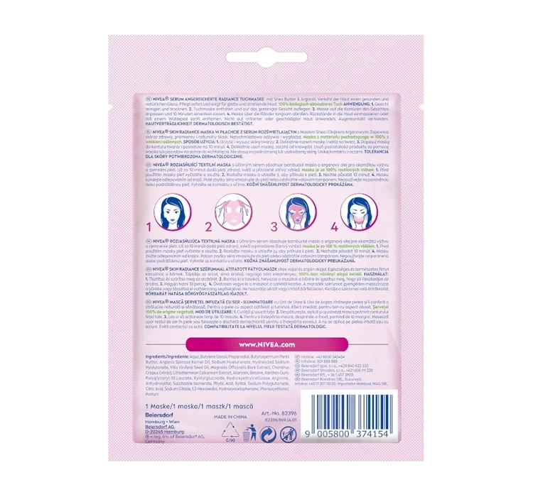 10-хвилинна тканинна маска, зроблена з екологічного волокна, збагачена аргановою олією і маслом ши. Забезпечує 3 миттєвих ефекти: досконало повертає блиск стомленій шкірі, інтенсивно живить і розгладжує її. Продукт підходить для вразливої шкіри.