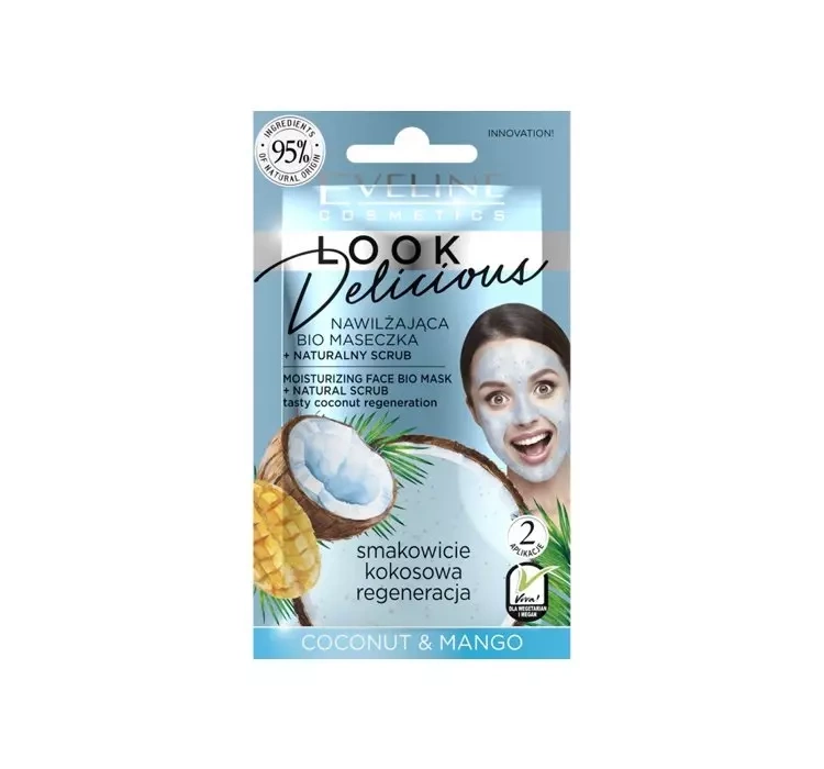 Зволожуюча біомаска особливо рекомендується для сухої та зневодненої шкіри. У її складі ви знайдете кокос і манго. Ці інгредієнти регенерують і розгладжують шкіру, заспокоюють подразнення та захищають її від висихання. Одного пакетика достатньо для двох застосувань. Аж 95% інгредієнтів маски мають природне походження. Продукт веганський і Cruelty-free, дерматологічно протестований.