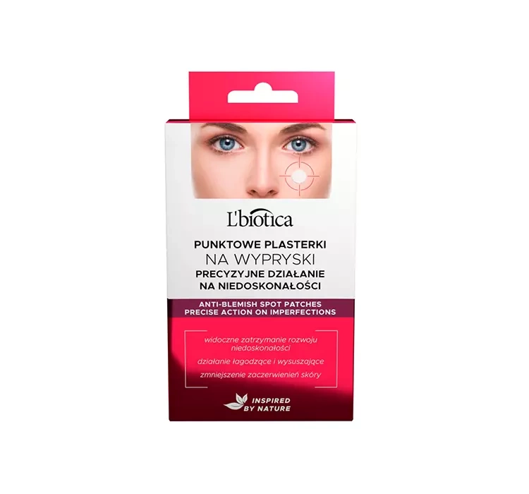 Точкові пластирі L'biotica Spot з антибактеріальною формулою призначені для місцевого застосування безпосередньо на вугрові висипання, такі як підшкірні висипання, прищі або папули.