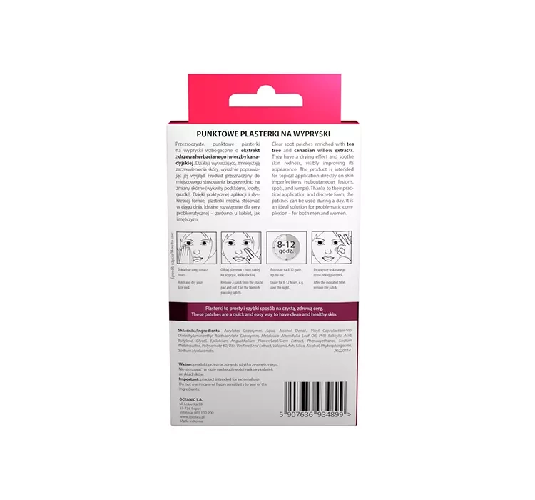 Пластирі збагачені екстрактом чайного дерева та канадської верби. В результаті вони підсушують шкіру, зменшують і заспокоюють запалення. Платирі зменшують розвиток недоліків, помітно покращуючи зовнішній вигляд шкіри.