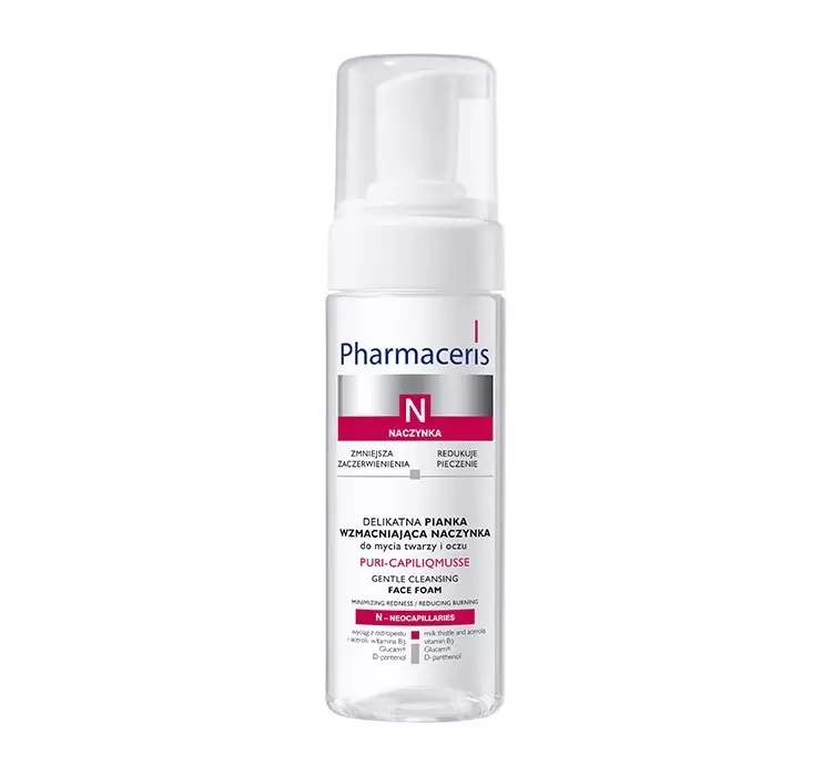 Pharmaceris N Puri-Capiliqmusse делікатна піна створена для щоденного миття обличчя та очей куперозної шкіри в кожному віці, схильною до почервонінь, еритеми, розширених та потрісканих капілярів. Вона успішно замінює традиційне мило.
