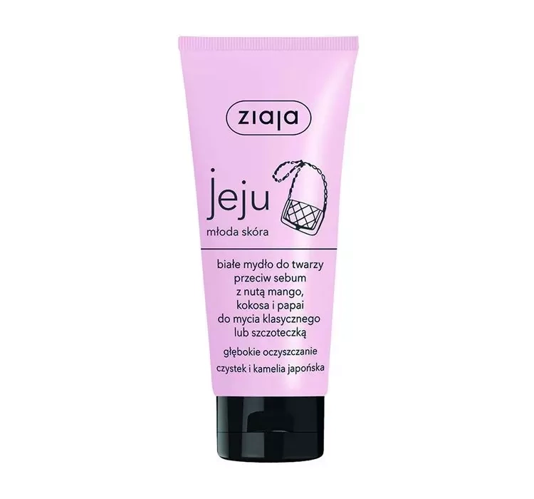 Ziaja Jeju Біле мило для обличчя з нотою манго, кокосу та папайї, проти шкірного сала, для класичного миття або щіточкою. Відповідає особливим потребам молодої шкіри, покращує зовнішній вигляд, освіжає і прикрашає. Допомагає позбутися від недосконалостей, заспокоює подразнення та почервоніння. Містить активні рослинні інгредієнти та має екзотичний аромат фруктового коктейлю. Біле мило для обличчя ретельно очищає, знежирює та розблокує пори від зайвого шкірного сала.