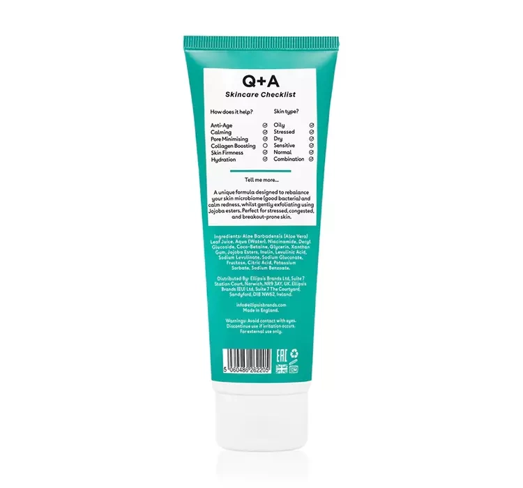 Очищаючий гель з ніацинамідом Q+A Niacinamide Gentle Exfoliating Cleanser підходить для регулярного використання для всіх типів шкіри. Ензимний пілінг з ефірами жожоба, інуліном і фруктозою неймовірно ефективний і набагато ніжніший за механічний, тому не викликає подразнення. Додавання екстракту алое прискорює загоєння ран і заспокоює епідерміс. Натуральні інгредієнти разом регулюють виділення шкірного сала, очищають пори та відновлюють належну напругу. В результаті обличчя м'яке, гладке і ідеально очищене.