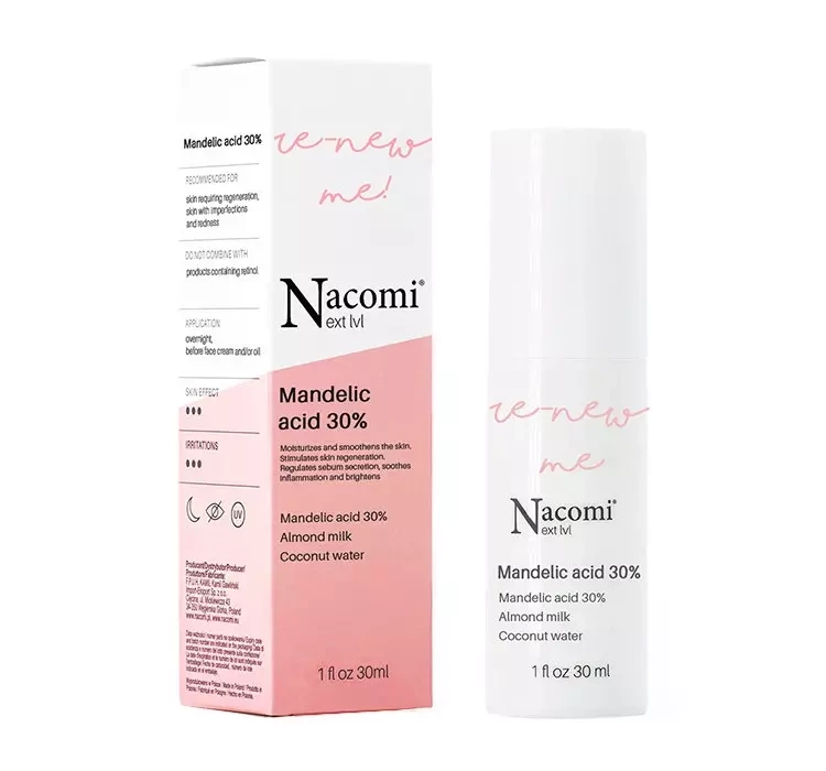 Nacomi Next Level Re-New Me! - сироватка-пілінг з 30% мигдальною кислотою, яка чудово відлущує, стимулює регенерацію та оновлення епідермісу. Мигдальна кислота ніжно, але ефективно зменшує недоліки, розгладжує зморшки та очищає шкіру від усіх забруднень. Засіб також пригнічує розвиток батарей і запобігає утворенню вугрів і прищів, що робить його ідеальним для догляду за проблемною шкірою. Він також відомий своїми кератолітичними та антисептичними властивостями. Крім того, інноваційна формула косметичного засобу збагачена кокосовою водою та олією макадамії, які прискорюють відновлення клітин епідермісу, вирівнюють колір і мають антивікові властивості..