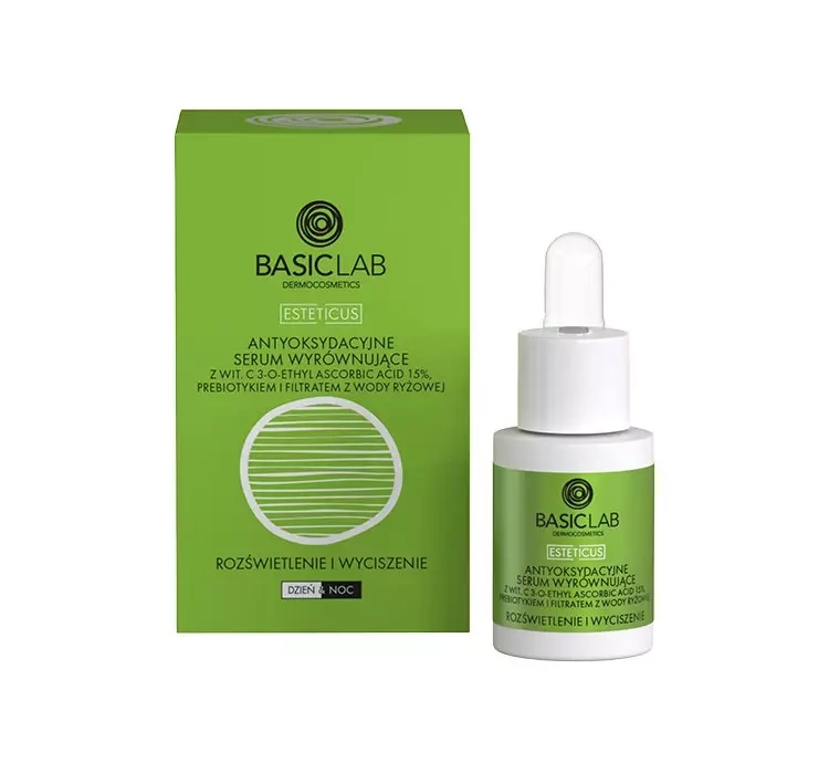 Антиоксидантна вирівнююча сироватка з вітаміном С 15% на день і ніч з серії BasicLab Esteticus – це спеціалізований косметичний засіб, розроблений для догляду за всіма типами шкіри. Його інноваційна формула містить 15% концентрацію 3-O-етиласкорбінової кислоти, яка стимулює вироблення колагену, завдяки чому ефективно розгладжує зморшки та повертає шкірі пружність і еластичність. Крім того, вона має протизапальні властивості, вирівнює тон шкіри та залишає її помітно освітленою. До складу продукту також входить відновлюючо-зволожуючий пребіотик і фільтрат рисової води, який чудово доглядає за шкірою та зменшує постакне. Вміст потужних антиоксидантів - глутатіону і ресвератролу - заповнює дрібні лінії, освітлює шкіру та редукує пігментні плями. Формула також збагачена екстрактом верби Флейшера і освіжаючим екстрактом огірка, які разом регулюють вироблення себуму, чинять заспокійливу дію та покращують стан жирної і комбінованої шкіри. При регулярному застосуванні сироватка вирівнює тон шкіри, залишаючи її гладенькою та сяючою. Крім того, покращує її пружність, еластичність і рівень зволоження.