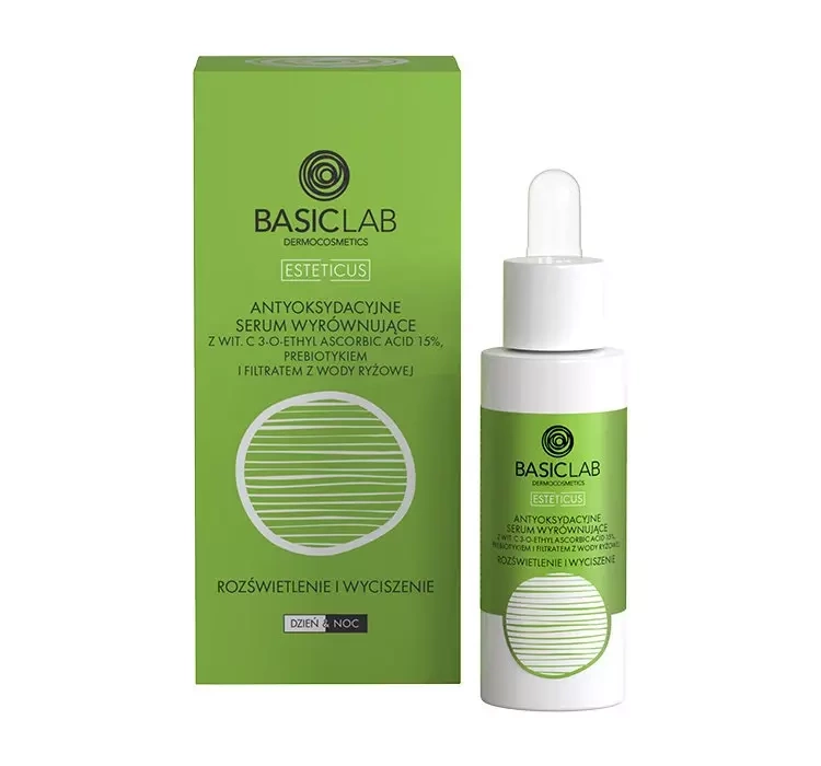 Антиоксидантна вирівнююча сироватка з вітаміном С 15% на день і ніч з серії BasicLab Esteticus – це спеціалізований косметичний засіб, розроблений для догляду за всіма типами шкіри. Його інноваційна формула містить 15% концентрацію 3-O-етиласкорбінової кислоти, яка стимулює вироблення колагену, завдяки чому ефективно розгладжує зморшки та повертає шкірі пружність і еластичність. Крім того, вона має протизапальні властивості, вирівнює тон шкіри та залишає її помітно освітленою. До складу продукту також входить відновлюючо-зволожуючий пребіотик і фільтрат рисової води, який чудово доглядає за шкірою та зменшує постакне. Вміст потужних антиоксидантів - глутатіону і ресвератролу - заповнює дрібні лінії, освітлює шкіру та редукує пігментні плями. Формула також збагачена екстрактом верби Флейшера і освіжаючим екстрактом огірка, які разом регулюють вироблення себуму, чинять заспокійливу дію та покращують стан жирної і комбінованої шкіри. При регулярному застосуванні сироватка вирівнює тон шкіри, залишаючи її гладенькою та сяючою. Крім того, покращує її пружність, еластичність і рівень зволоження.