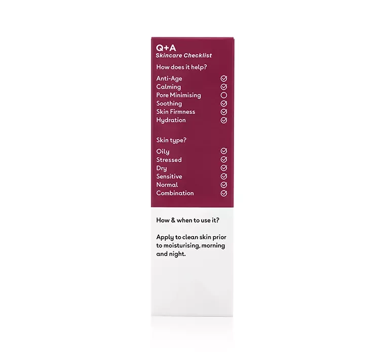 Кожен продукт Q+A має чисту формулу - без зайвих наповнювачів, мінеральної олії чи додавання штучних ароматизаторів. Це зводить до мінімуму виникнення можливого подразнення шкіри або алергії. Весь асортимент косметики для догляду за шкірою Q and A на 98% складається з натуральних інгредієнтів, отриманих з дотриманням етичних принципів, сертифікованих COSMOS. Вони cruelty free і переважно веганські (за винятком кількох продуктів, що містять бджолиний віск).