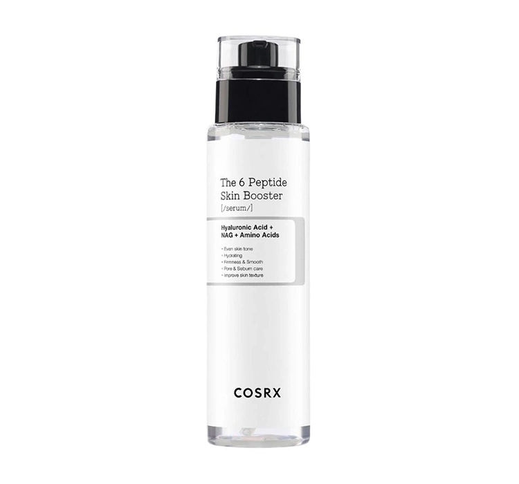 COSRX The 6 Peptide Skin Booster – інноваційна сироватка для обличчя, яка комплексно підтримує відновлення та покращення стану шкіри будь-якого типу. Формула сироватки, заснована на комплексі 6 пептидів, гіалуроновій кислоті, ніацинамідові, аденозині та амінокислотах, діє багатофакторно, підвищуючи пружність і еластичність шкіри, згладжуючи дрібні лінії та зморшки та забезпечуючи глибоке зволоження і живлення. Легка текстура сироватки COSRX швидко всмоктується, залишаючи шкіру м’якою, гладкою та сяючою, що робить її ідеальною для щоденного догляду.