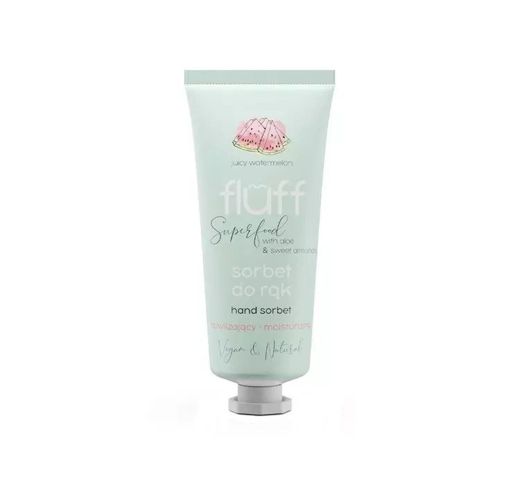 Fluff Hand Sorbet - це зволожувальний крем для рук з легкою, гелевою консистенцією і ароматом соковитого кавуна.Сорбет містить сок з алое, який відомий своїми зволожувальними і заспокійливими властивостями. Запобігає сухості шкіри рук, робить її м'якою і гладенькою. Усуває подразнення і прискорює процес загоювання ран. Надає сухим долоням відчуття комфорту. Олійка з солодкого мигдалю чудово підходить для шорсткої та стягнутої шкіри, а також зволожує, сповільнює процеси старіння і повертає втрачений блиск. Усуває мертві клітини епідермісу і підтримує ліпідний бар’єр, захищаючи долоні. Сорбет подарує для рук м'якість, живлення і зволоження.