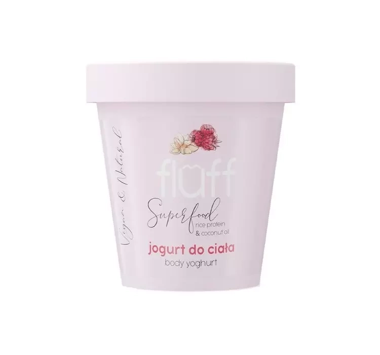 Fluff Body Yoghurt - це глибоко зволожувальний бальзам для тіла з прекрасним ароматом малини та солодкого мигдалю.Легкий йогурт для тіла містить протеїни рису, завданням яких є відновлення належної мікрофлори шкіри та її захист від шкідливих зовнішніх факторів. Олійка з солодкого мигдалю чудово підходить для шорсткої та стягнутої шкіри, а також зволожує, сповільнює процеси старіння і повертає втрачений блиск. Усуває мертві клітини епідермісу і підтримує ліпідний бар’єр. Кокосова олія має відновлювальні і згладжувальні властивості. Вона захищає від сонячного випромінювання і усуває недосконалості.Йогурт проникає в глибокі шари шкіри і регенерує її та додає пружності, запобігаючи надмірній втраті води з епідермісу.