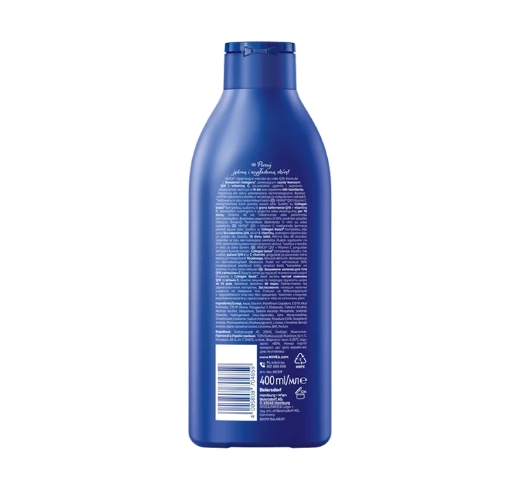 Зміцнювальне молочко для тіла Nivea Q10, збагачене двома сильними антиоксидантами - коензимом Q10 і вітаміном C. Вдосконалена формула помітно зміцнює і покращує пружність шкіри вже після 10-ти днів застосування! Живильне молочко для тіла інтенсивно зволожує шкіру впродовж 48 годин.