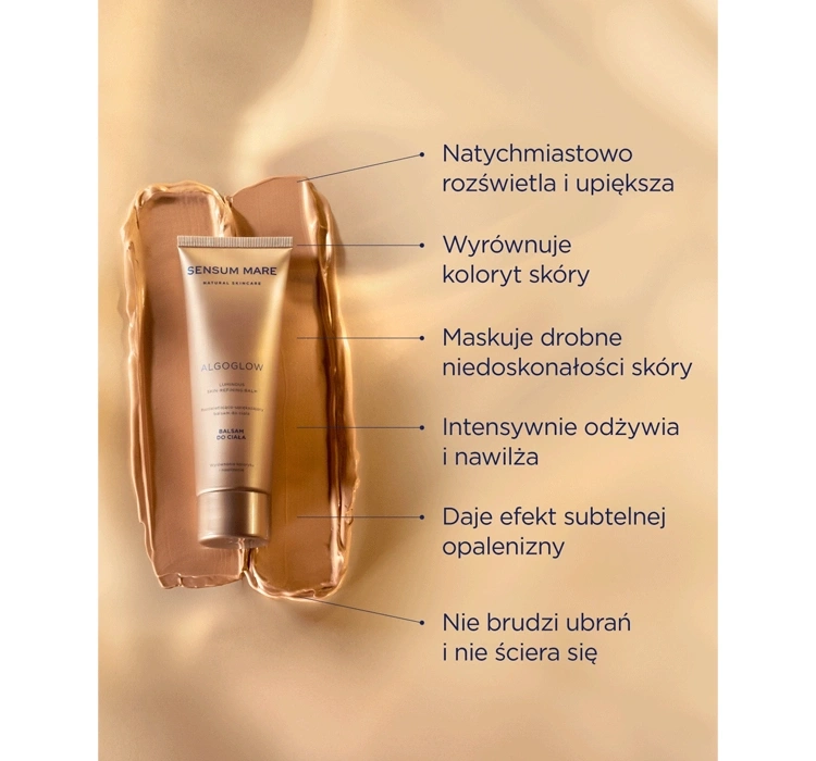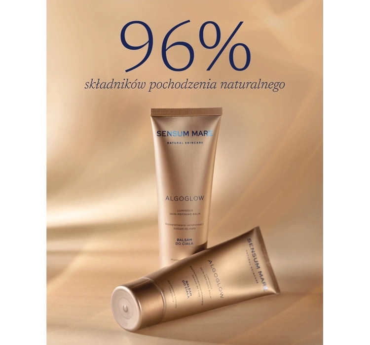 Sensum Mare Algoglow Luminous Skin-Refining Balm — унікальний сяючий бальзам для тіла, що дарує шкірі ефект м’якого золотистого сяйва „golden hour”. Делікатно вирівнює тон, надає шкірі природного блиску, маскує дрібні недоліки та створює ефект легкої, здорової засмаги. Шовковиста текстура легко розподіляється, швидко вбирається, не залишаючи плям і слідів на одязі — ідеальний вибір перед виходом з дому.