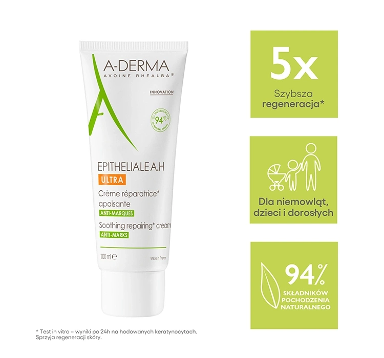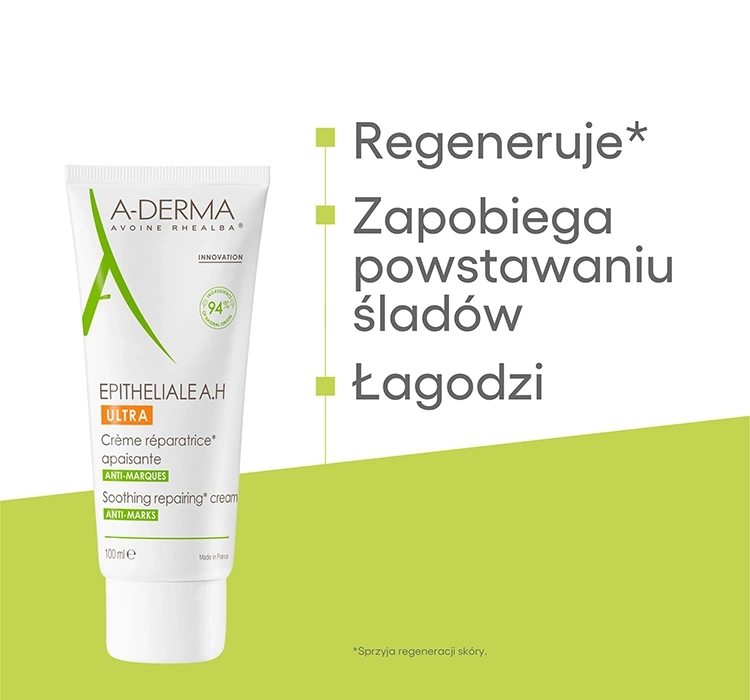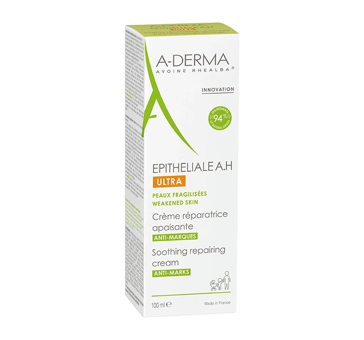 Epitheliale A.H Ultra - це заспокійливо-відновлюючий крем від A-Derma, який рекомендується, зокрема, для догляду за ослабленою шкірою, пошкодженою поверхневими дерматологічними процедурами, наприклад, після пілінгу або лазера. Завдяки м'якій формулі косметику можна використовувати на шкірі дорослих, дітей і немовлят.