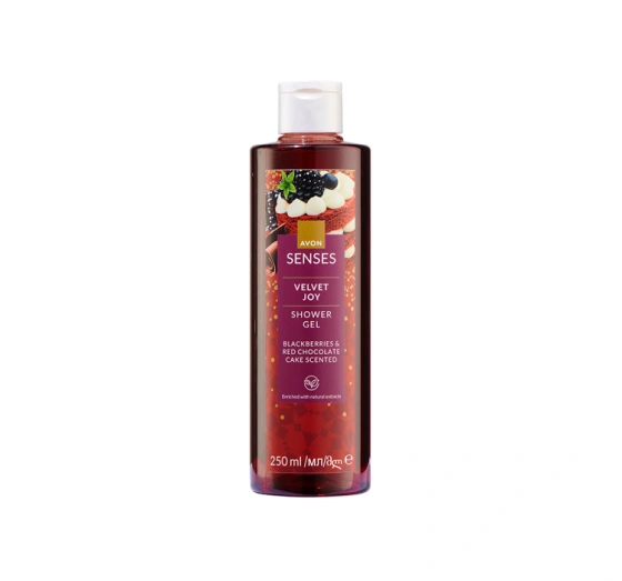Avon Senses Velvet Joy Shower Gel Blackberries & Red Chocolate Cake — це гель для душу, який перетворює щоденні прийоми душу на розкішний ритуал догляду. Його оксамитова, гелева текстура ніжно очищає тіло, залишаючи шкіру м’якою, гладкою та освіженою. Соковиті ноти ожини у поєднанні з ароматом шоколадного торта (Red Velvet Cake) огортають тіло солодко-пряним запахом, створюючи приємний гурманський настрій під час кожного душу.