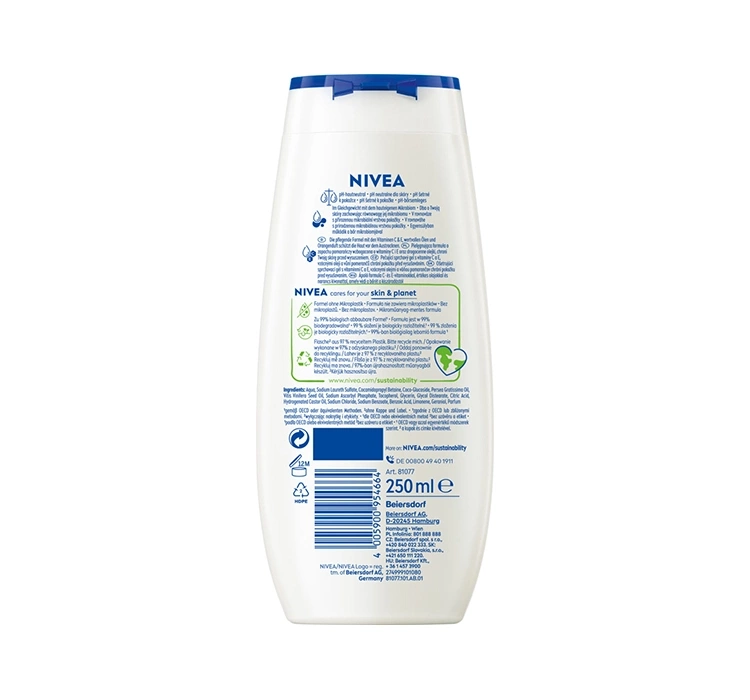 Гель для душу NIVEA Summer Happiness підходить для всіх типів шкіри та має нейтральний для шкіри pH, що робить його ніжним і безпечним навіть для чутливої шкіри. Формула на 99% біологічно розкладається і не містить мікропластику.