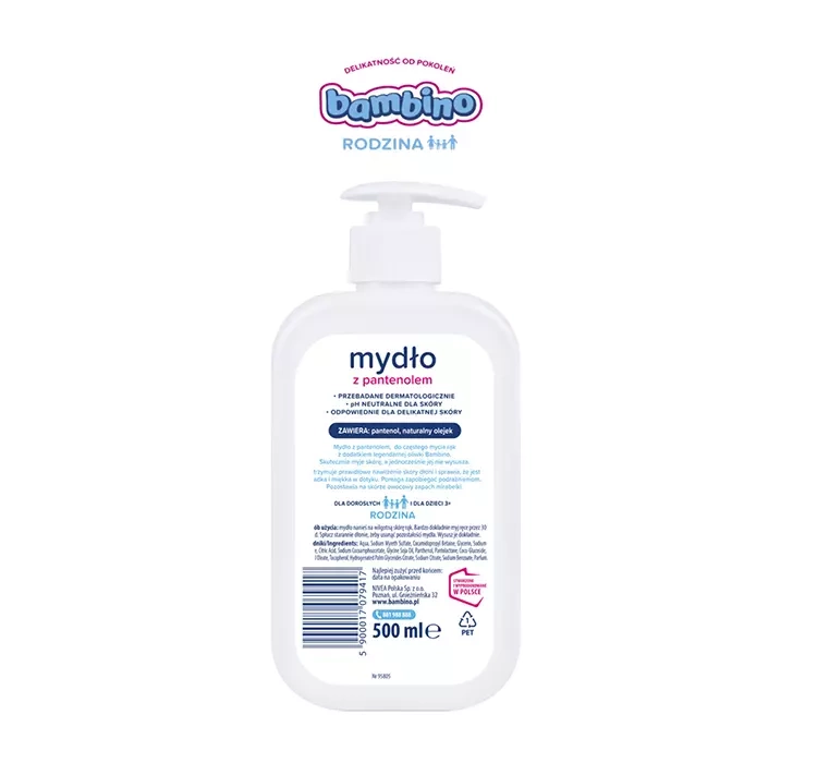 Мило з пантенолом марки Bambino Rodzina - це гіперделікатний продукт, ідеальний для щоденного догляду та очищення рук і всього тіла. Мило має природний для шкіри рН. Його можуть використовувати діти віком від 3 років.