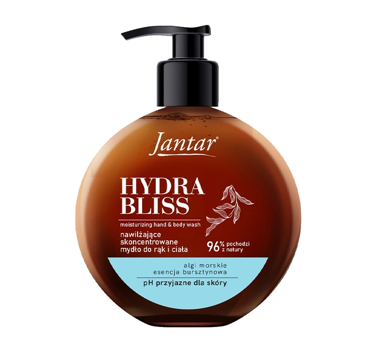 Рідке мило Jantar Hydra Bliss збагачене морськими водоростями, які активно підтримують процеси регенерації шкіри, надаючи їй м’якості та еластичності. Бурштинова есенція живить та дарує природне сяйво, тоді як збалансований pH допомагає зберегти захисний бар’єр, запобігаючи сухості та стягнутості. Завдяки цьому мило ідеально підходить навіть для сухої та чутливої шкіри.