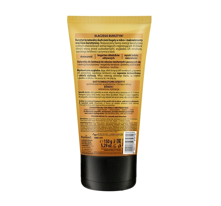 Польща Засіб для ламінування волосся Farmona Jantar - унікальний косметичний засіб для догляду за неслухняними і пухнастими пасмами. Інноваційна формула заснована на ідеальному поєднанні бурштинової есенції, веганського кератину, протеїнів пшениці, бетаїну та інуліну, які разом забезпечують комплексний догляд за волоссям. Косметичний засіб глибоко проникає в структуру волосся і помітно зміцнює, зволожує і відновлює будь-які дефекти. Засіб помітно розгладжує структуру волосся та запобігає його ламкості, пушінню та сплутуванню. Забезпечує ефективний захист від високих температур і полегшує щоденне укладання. Регулярне використання засобу робить волосся гладким, блискучим, густим та міцнішим.