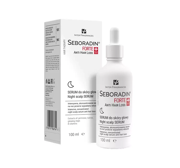 Нічна сироватка для шкіри голови Seboradin Forte Anti Hair Loss має інтенсивну формулу, яка гальмує випадіння волосся. Довгий час перебування сироватки на шкірі голови допомагає активним інгредієнтам, що містяться в ній, легше засвоюватися та стимулювати волосяні фолікули. До складу сироватки проти випадіння волосся Forte входять екстракт первоцвіту лікарського, рускусу колючого, женьшеню і хмелю, а також вітаміни групи В. Разом вони покращують стан пасом, зміцнюючи їх, потовщуючи та підтримуючи правильний ріст.